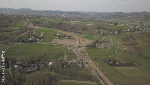 Laying gas pipeline among green hills. Large high-pressure steel pipes prepared for immersion in the excavated trench. Land works in the strategic industry. Energy and natural resources