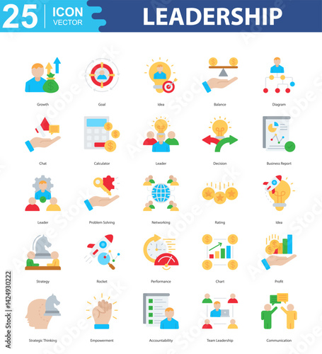 Leadership icon sheet vector growth, goal, idea, balance, diagram, chat, calculator, leader, decision, business report, leader, problem solving, networking, rating, idea, strategy, rocket, performance