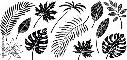 Leaf silhouettes vector set featuring tropical, floral, and botanical elements. nature design collection includes various leaf shapes perfect for eco, organic, and decorative art or digital project