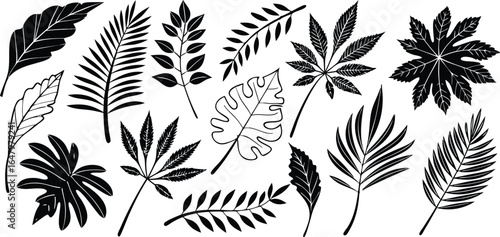 Leaf silhouettes vector set featuring tropical, floral, and botanical elements. nature design collection includes various leaf shapes perfect for eco, organic, and decorative art or digital project