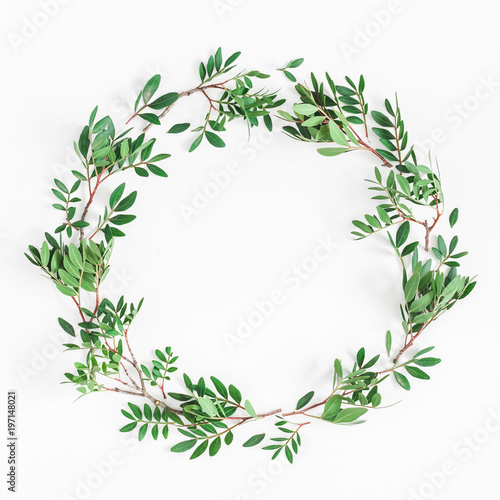 Leaf wreath. Pistachio leaves on white background. Flat lay, top view, square, copy space