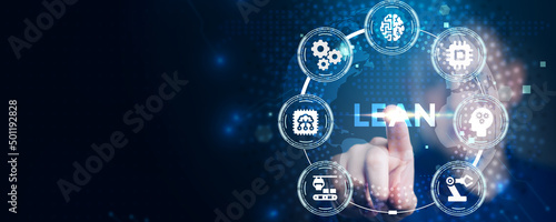 Lean, Six sigma, quality control and manufacturing process management concept on virtual screen.