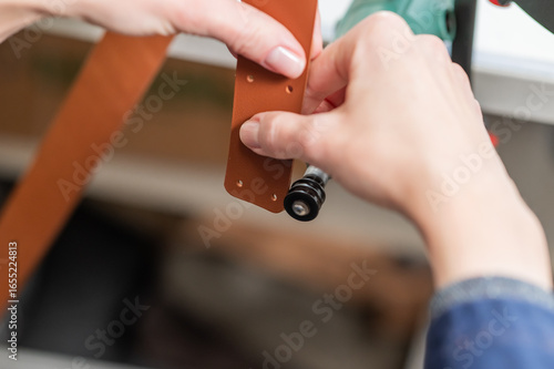 Leatherworker grinding the edge of a strip of leather for a belt in the workshop.