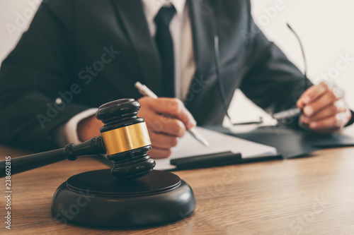 Legal law, advice and justice concept, counselor lawyer or notary working on a documents and report of the important case and wooden gavel, brass scale on table in courtroom