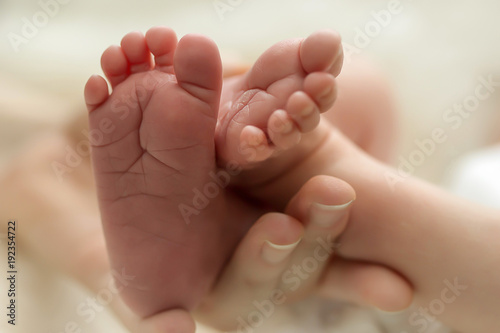 Legs newborn in parents hand