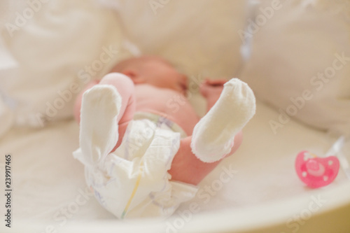 Legs of baby on the background of white sheets. The baby is lying in the crib among the pillows. Soft focus