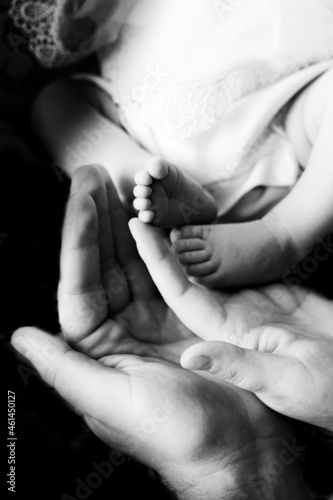Legs of the baby in the hands of the sister and mother
