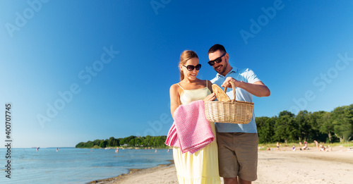 leisure, relationships and people concept - happy couple with picnic basket walking along beach