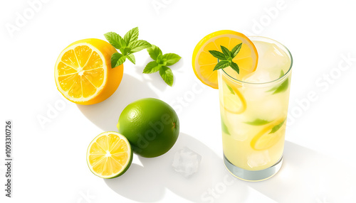 Lemonade drink with fresh lemons, lime, mint and ice. Refreshing citrus mojito cocktail on a light background with shadow. Summer cold drinks concept isolated with white highlights, png