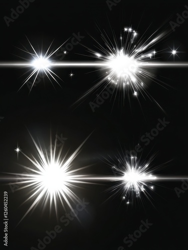 Lens effects. Camera flash light, flare. White light spot glowing sparkles, starlight isolated on transparent background vector set