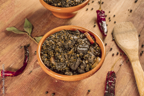 Lentil stew, shot with bay leaves and chili peppers