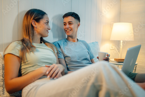 Lesbian couple relaxing in bed, talking and drinking coffee