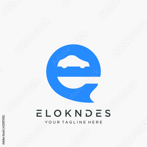 Letter E with car negative space Logo Template Vector Design. Social Talk, chat, app, forum, social media. Modern logotype symbol - vector