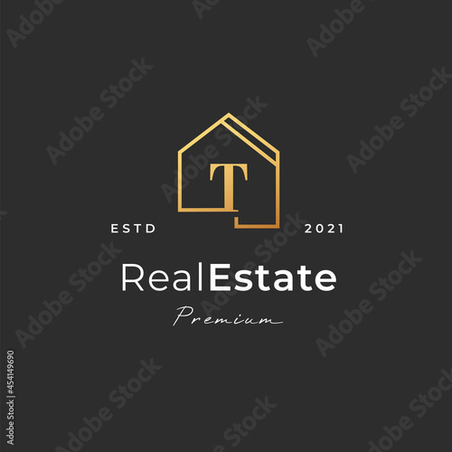 Letter T logo with real estate house icon luxury line style, Vector illustrations