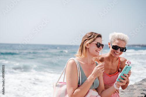 LGBT couple eating ice cream while checking their smartphone on a day at the beach together. summer