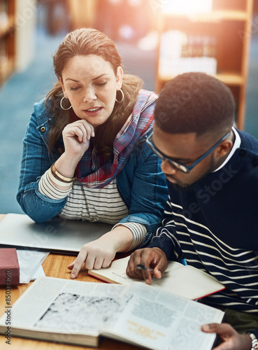 Library, people and studying with book, desk and reading for exam, woman and man in campus of college. Students, friends and teamwork for test, information and table with research and together