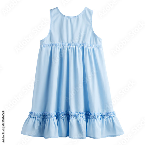 Light blue sleeveless girls dress with ruffled hem and smocked bodice back view