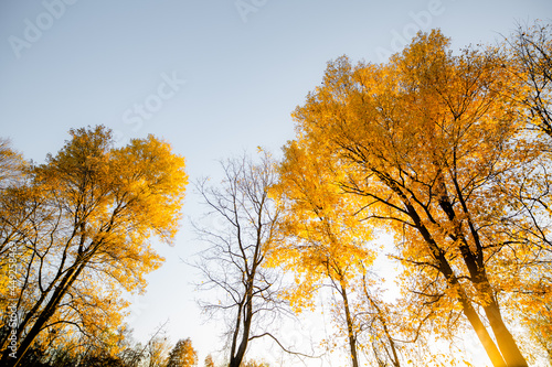 Light bursting through yellow fall colored autumn trees in a beautiful countryside forrest_10