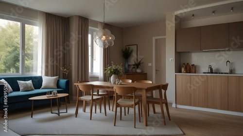 Light eating room interior with table and seats, stand and mockup frame.generative.ai