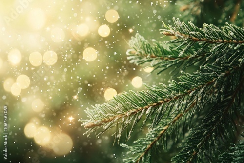 Light fresh green pine tree branches with golden lights snow background christmas.