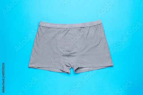Light gray men's classic underpants on a blue background.