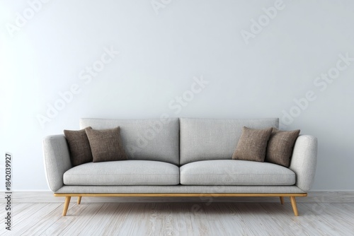 Light gray sofa with brown cushions sits against a white wall.