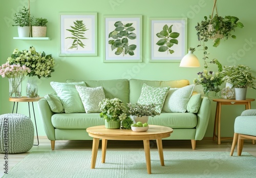 Light Green Living Room Interior with Pastel Decor and Botanical Prints