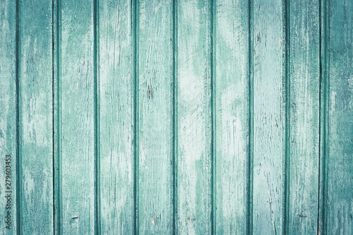 Light green wooden fence in lines. Wooden painted boards with scuffs. Old wood texture background. Copy space. Dilapidated wood surface.