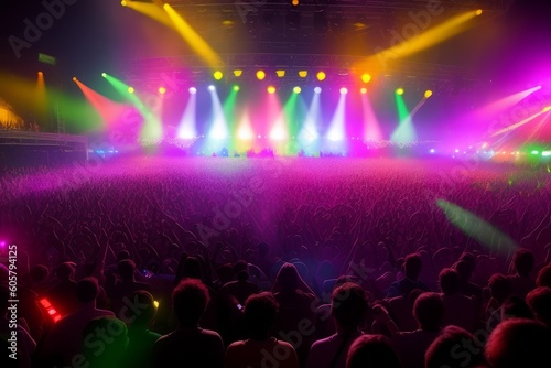 Light Show And Silhouette of audience crowd people use smart phones enjoying club party with concert. Blurry night club DJ party people enjoy of music dancing sound. Abstract Background. Generative AI