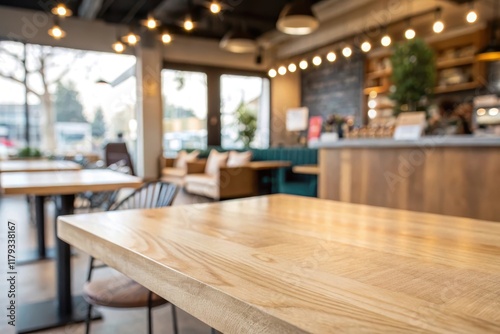 Light Wood Table in a Casual Cafe Setting with a Blurred Background