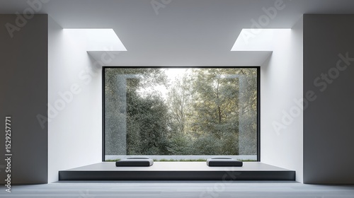Light-filled bedroom with garden view and square windows positioned symmetrically
