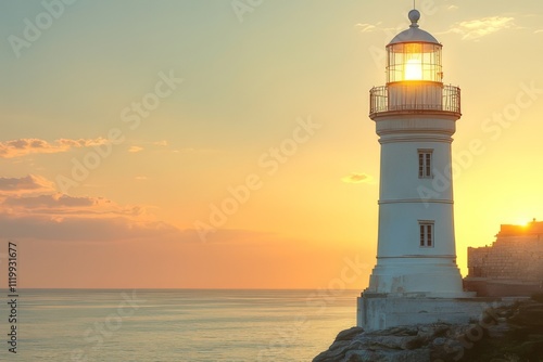 Lighthouse at sunset overlooking calm ocean waters illuminating the coastline
