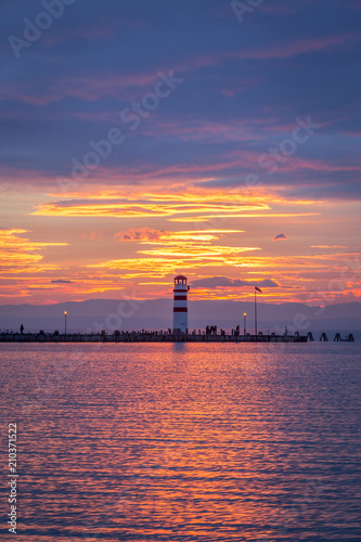 Lighthouse in Podersdorf am See at winter sunset, lake Neusiedler See, Burgenland, Austria