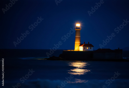 Lighthouse stands tall on the coast, casting light over the serene waters of the night as waves gently lap against the shore.