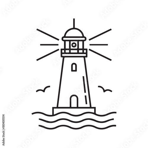 Lighthouse thin line icon. Nautical beacon tower with light beams over sea waves. Simple vector illustration of a coastal landmark for marine navigation logo.