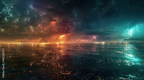 Lightning cuts through the abstract night sky. Dark clouds churn, signaling the storm's presence.