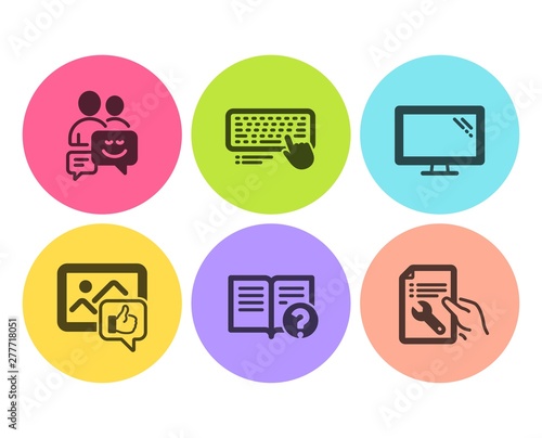 Like photo, Monitor and Help icons simple set. Communication, Computer keyboard and Repair document signs. Thumbs up, Computer component. Technology set. Flat like photo icon. Circle button. Vector