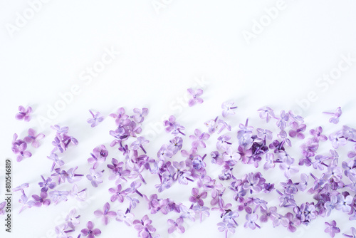 Lilac flowers and petals on white background. Flat lay, top view, copy space