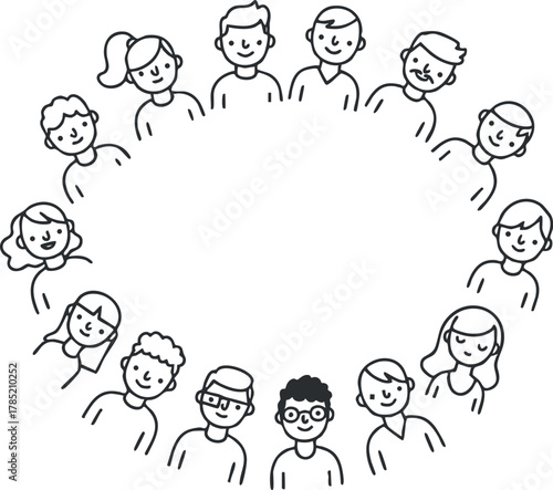 Line art illustration of diverse characters in a circle, representing community and friendship for social projects and designs