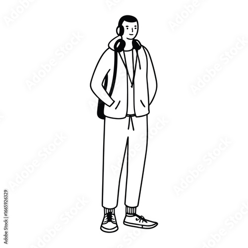 Line Art Illustration: Young Man with Headphones and Backpack vector