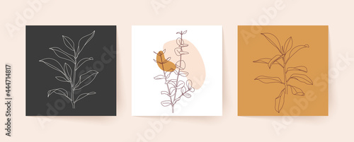 Line drawing of tropical plants with abstract organic shapes. Modern single line art. Vector illustration.