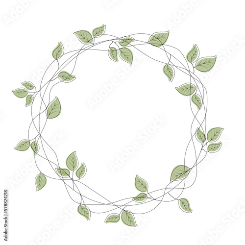 Line drawing spring vector round wreath with green leaves.