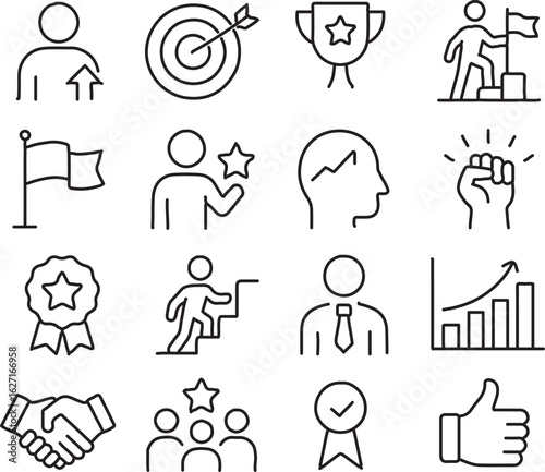 Line icon set symbolizing goal achievement and growth, business motivation and success