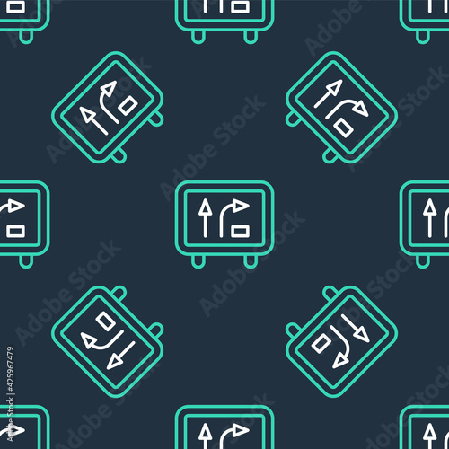Line Road traffic sign. Signpost icon isolated seamless pattern on black background. Pointer symbol. Isolated street information sign. Direction sign. Vector
