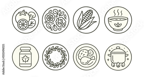 Line style icons of food and drinks: seasonal ingredients icon, spring salad ring, summer grilled corn, fall soup bowl, winter stew pot, seasonal spice jar, fresh herb ring, harvest meal badge.