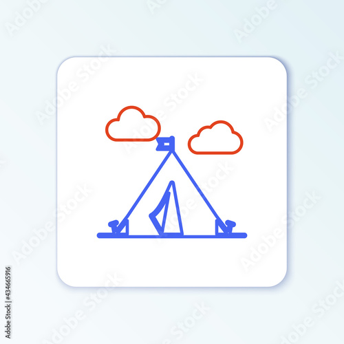 Line Tourist tent with flag icon isolated on white background. Camping symbol. Colorful outline concept. Vector
