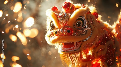 Lion dance performance with sparkling background. Vibrant colors and dynamic movement. Festive celebration.