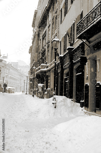 Lipscani Bucharest Old Town on a snowing winter day