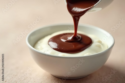 Liquid chocolate flows slowly over the surface of a bowl filled with a creamy white substance, treat, golden