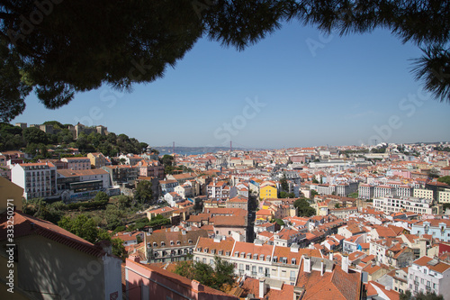 Lissabon, Portugal: Blick zur Festung Castelo de São Jorge über die Altstadt Viertel Alfama und Baixa hinüber zum Bairro Alto und der Brücke Ponte 25 de Abril
